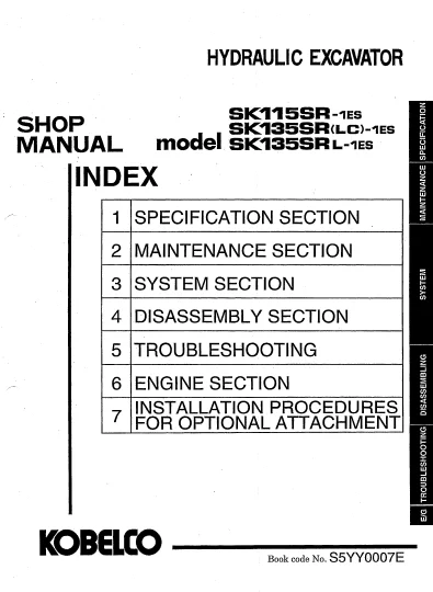 Este manual está diseñado exclusivamente para la MANUAL SERVICIO EXCAVADORA KOBELCO SK115SR-1ES SK135SR(LC)-1ES SK135SR(L)-1ES, ampliamente utilizada en proyectos de construcción y movimientos de tierra.